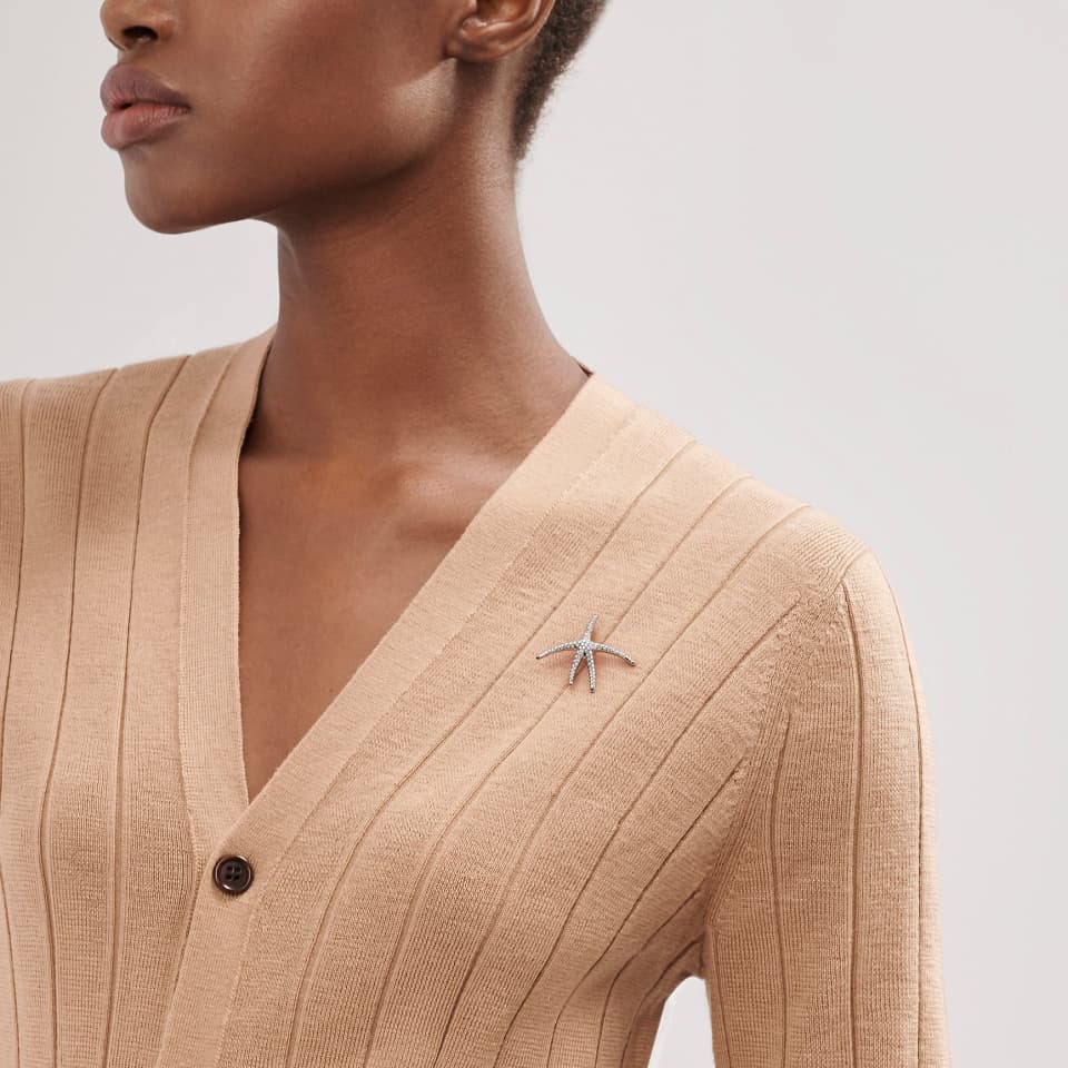 The starfish evokes life beneath the waves and in the celestial heavens. Brooch in platinum with pavé diamonds.