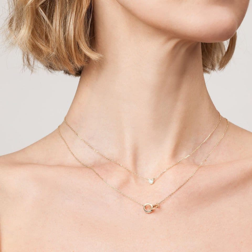 A delicate 18k yellow gold chain combined with two interlocking circles defines this modern pendant.